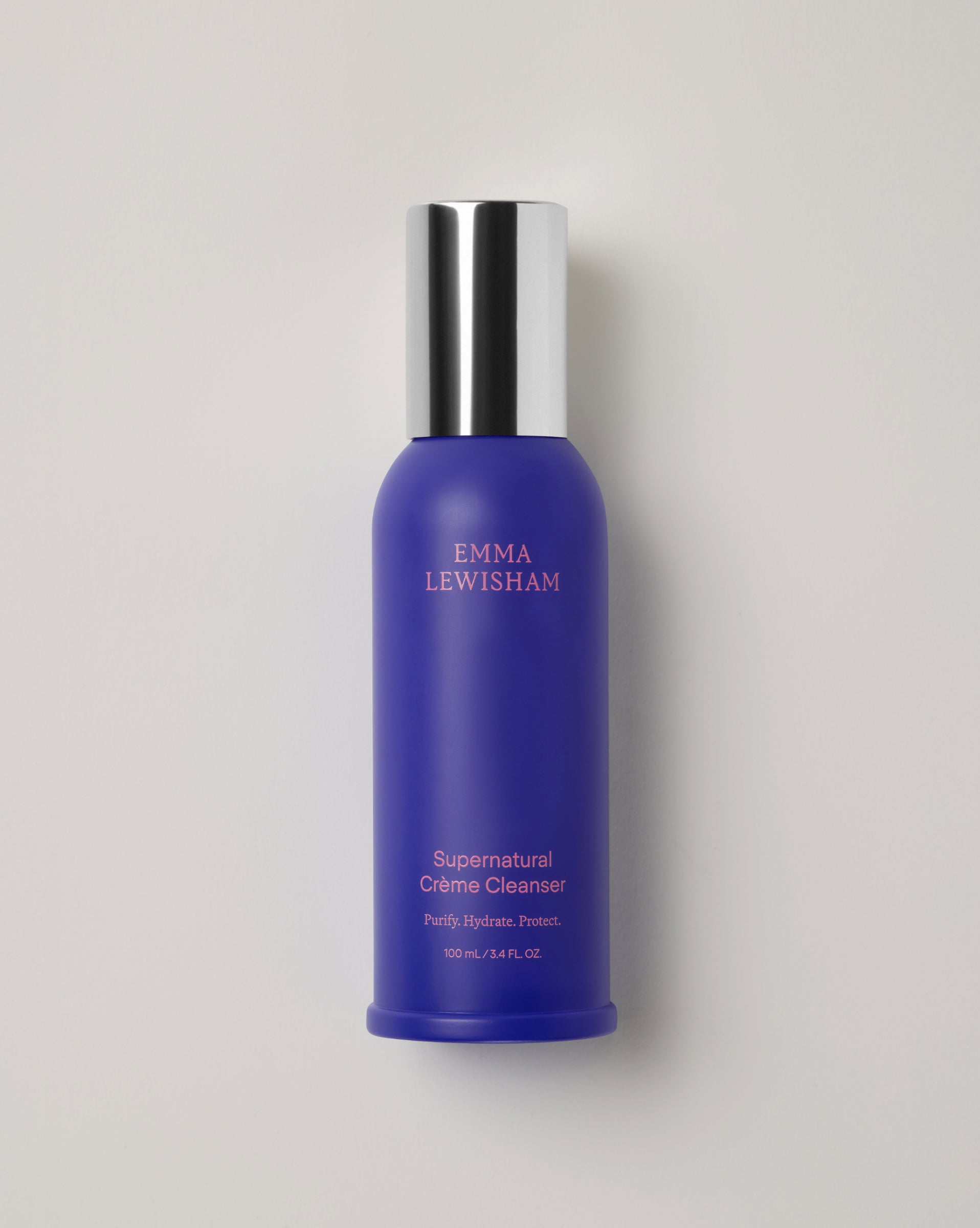 Emma Lewisham Illuminating Oil Face Cleanser in a purple bottle with silver lid against a light grey background.